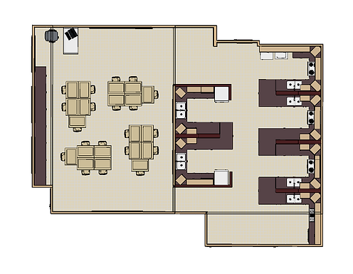 My first project was the foods room. The foods teacher requested a design to be efficient and updated. The teacher needed 6 work areas (one of which is handicapped accessible) and the work area must be able to comfortable fit 4-5 students. She also wanted to blow out the dividing wall in the middle of the room. I started off by making a replica of the current foods room which allowed me to easily rearrange objects from there. My new layout design allowed for much more open space and added an open shelving unit for each station as well as bar stools for the kids to sit on. To allow for commercial use, I added a 3 compartment sink at the new stations for the students to learn the efficient way of dish washing. The teachers were very pleased with the new design and the principal Dr. Rowe is going to consider the addition in next year's construction.